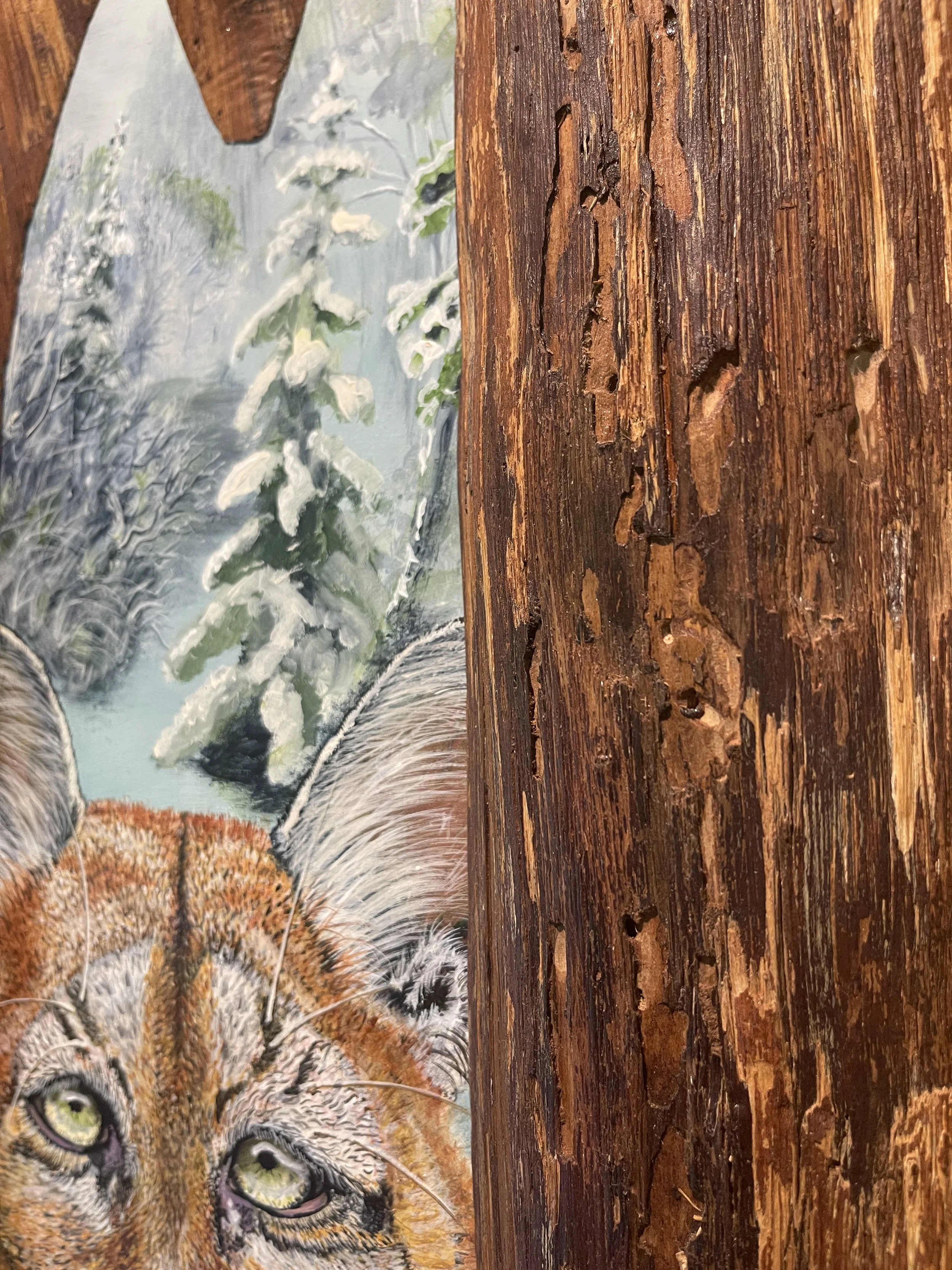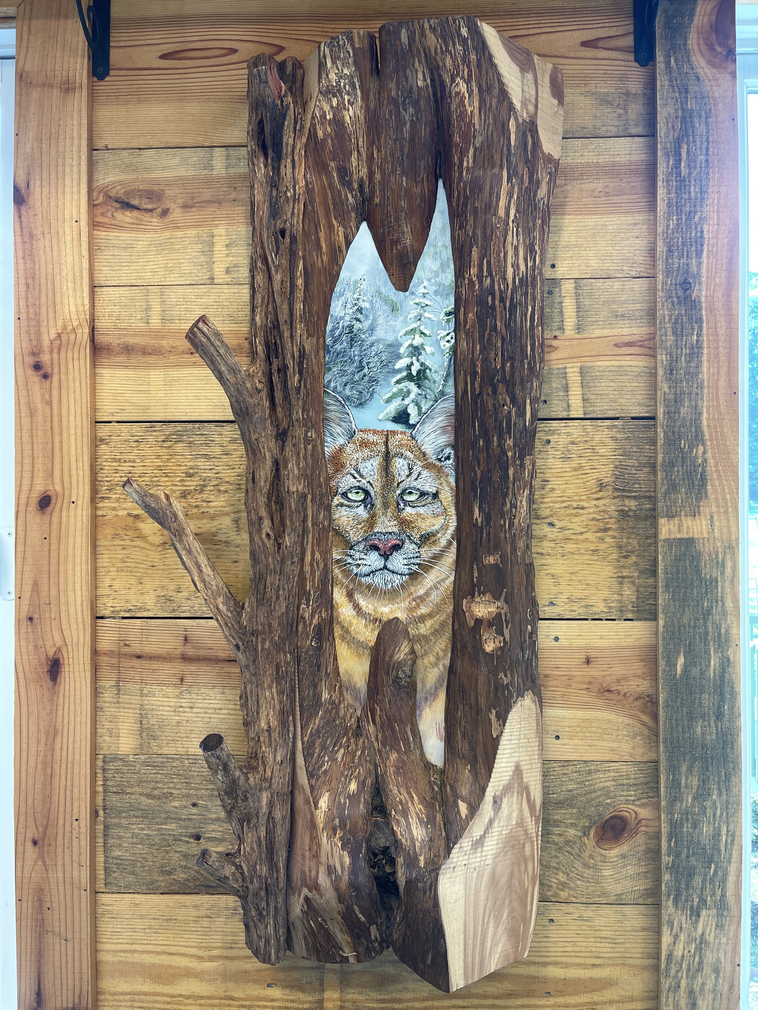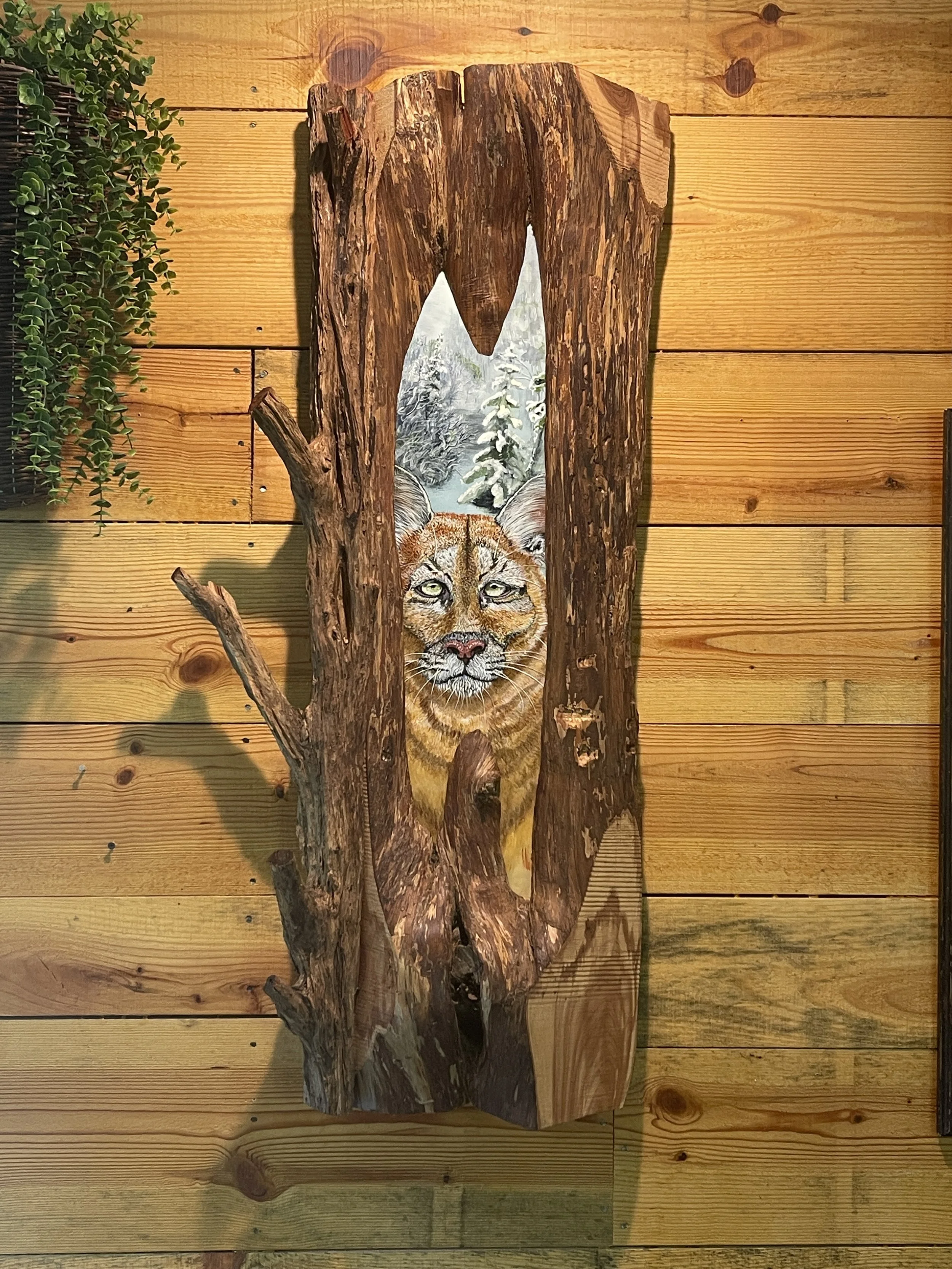 This one-of-a-kind piece is a stunning fusion of fine art and natural sculpture. Painted by hand, the powerful image of a mountain lion emerges from within a hollowed piece of natural wood, its gaze steady, watchful, and full of quiet strength. The painting itself is nestled into the back of a naturally formed opening in the tree, creating the sense that you are peering into the wild through a window in the forest.